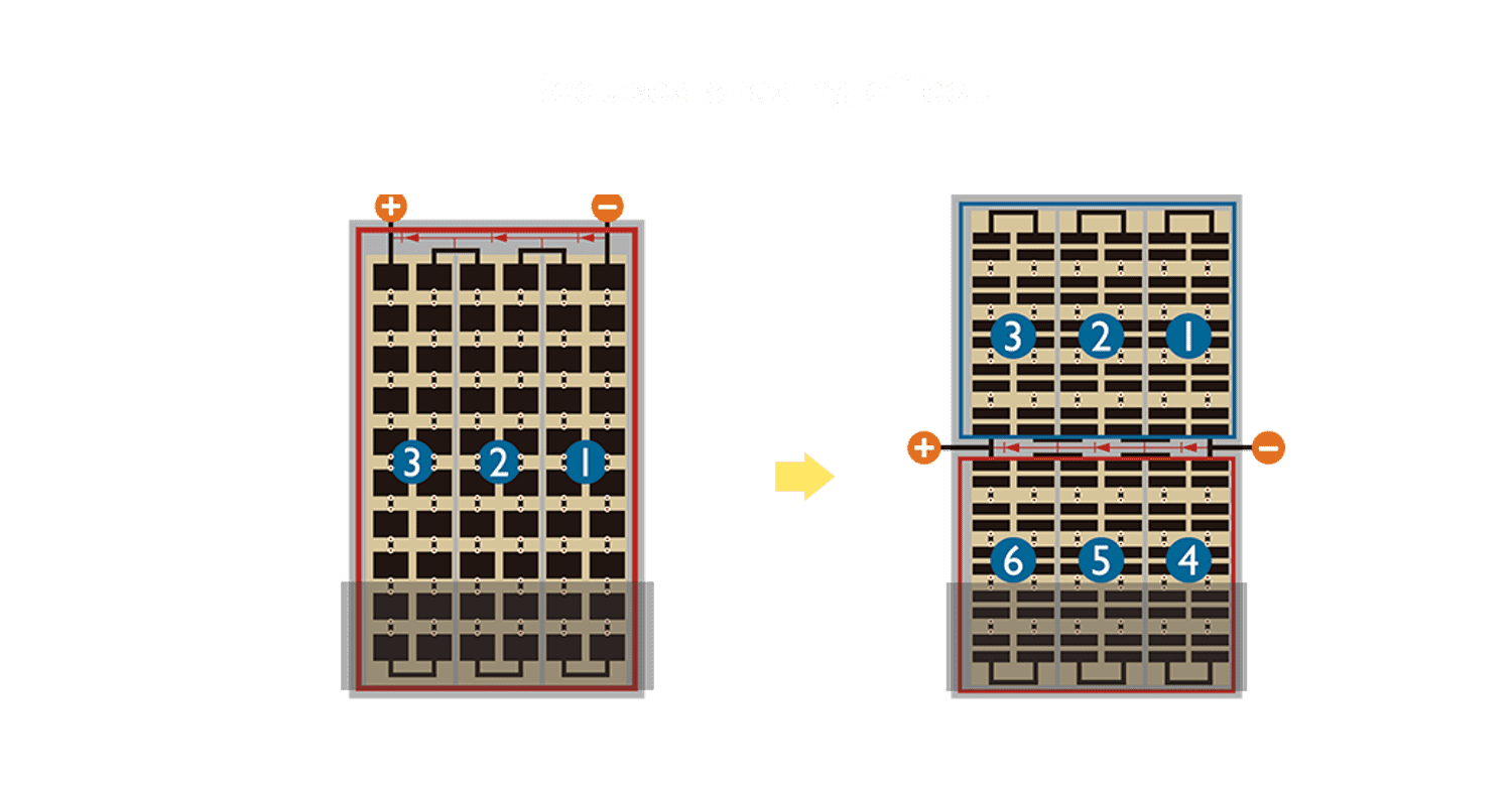 - 结合半切电池,,,降低遮阴影响、、、提升模组抗隐裂能力、、、、并减少电阻损耗,,进一步提升模组发电效能。。。。