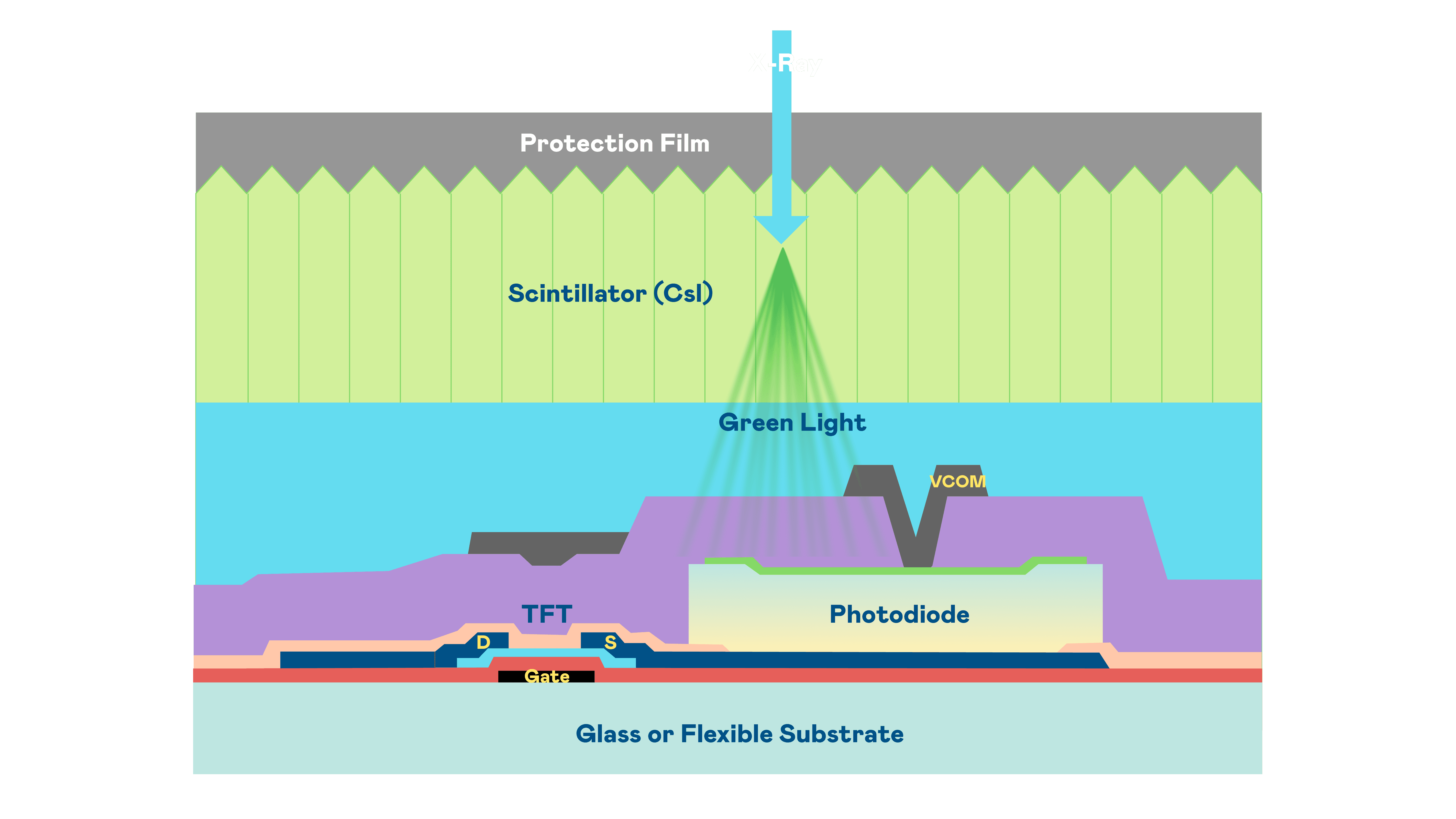 人生就是博的X光影像感测阵列使用薄膜电晶体 (TFT) 作为每个像素的读取开关,,,搭配光电二极体(Photodiode)的光电转换元件,,,用以感测X光影像讯号。。。。